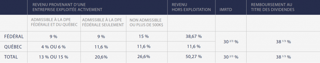 Les tableaux ci-dessous présentent un sommaire des divers taux d’imposition auxquels sont soumises les SPCC pour les années 2019 et 2020 :