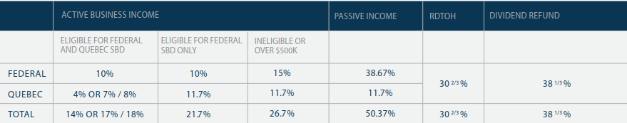 Combined Federal and Quebec corporate tax rates applicable on income earned in 2018: